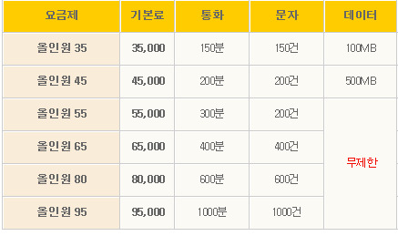 SKT 올인원 45 요금제 45000원 한달 500MBytes