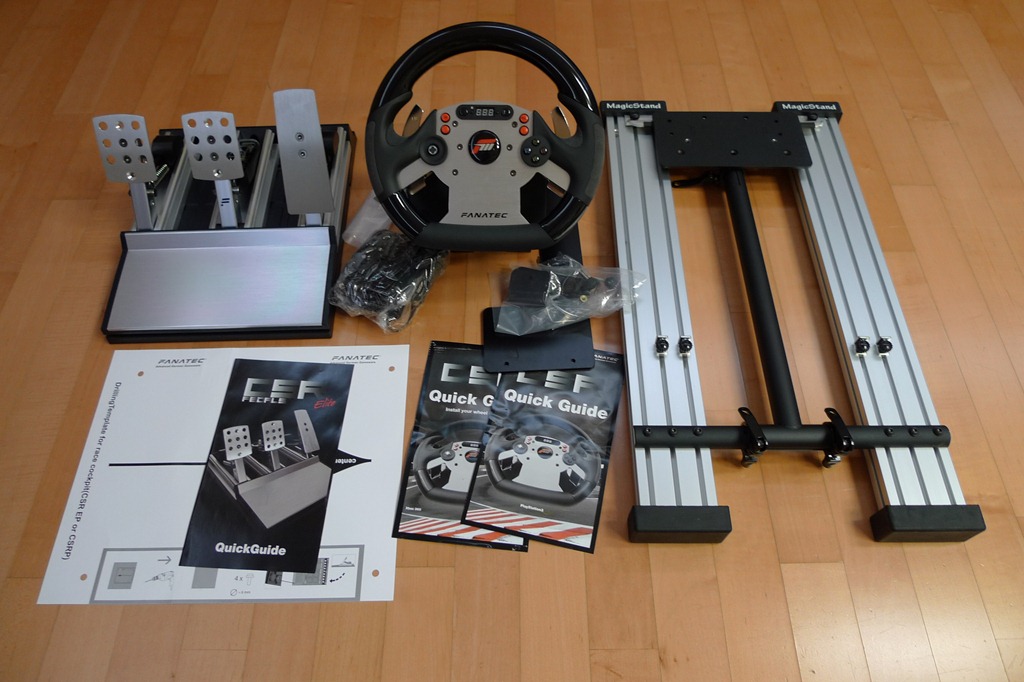 좌로부터 FANATEC CSR Elite 페달과 CSR 휠, 그리고 매직스탠드