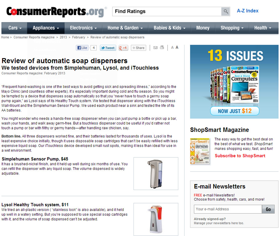 Consumer Reports에서 자동 물비누 디스펜서에 대한 기사가 실렸습니다. 제품에 대한 구입 가이드이기도 하지만, 제가 주목한 것은 이런 오토매틱 디스펜서가 더 빠르고 편리하게 손을 씻을 수 있게 해 준다는 설명에 있었습니다.