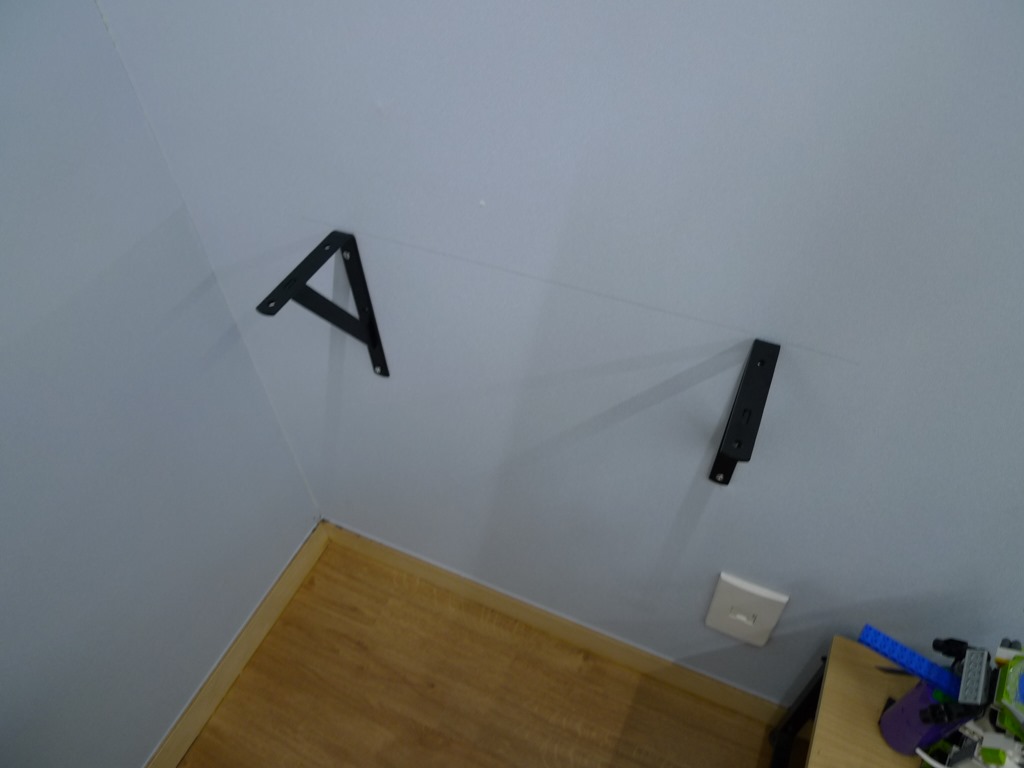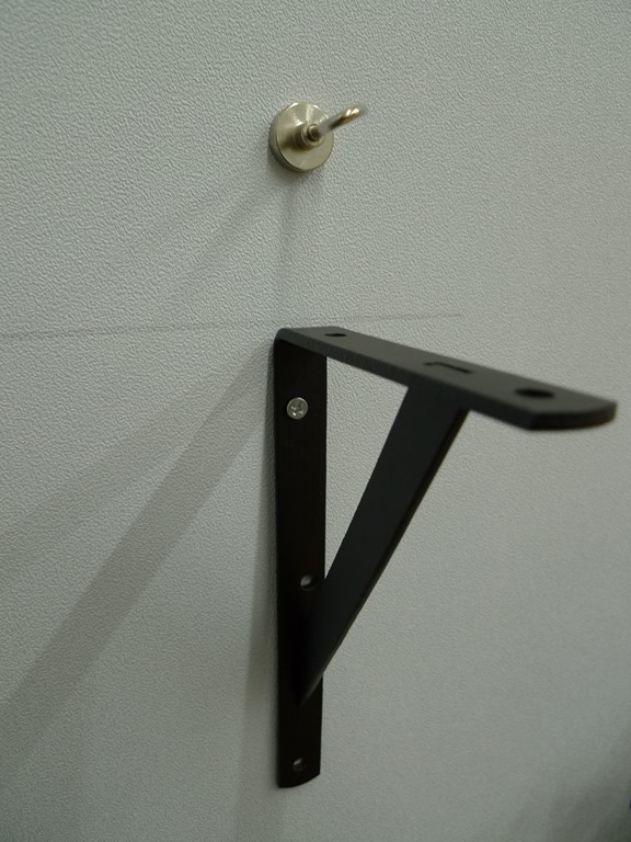 벽면에 책선반을 올리기 위한 까치발 부착하기.. 위의 은색 고리는 그냥 자석 고리입니다. 이 자석고리로, 벽면의 석고보드 뒷면의 스터드를 찾기 위해 석고보드를 부착한 피스를 찾아 스터드 위치를 확인하고, 그 아래에 까치발 부착..
