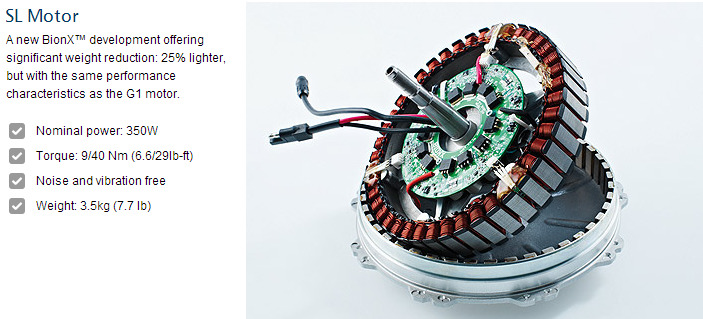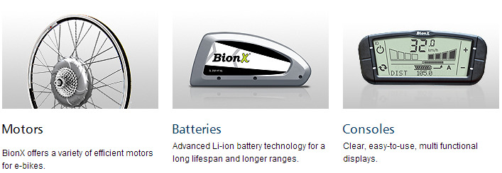 보쉬나 파나소닉의 ebike시스템과 달리 허브모터 시스템이기때문에 기존의 자전거 프레임의 개조 없이 BionX ebike 키트를 설치하여 자전거를 전기자전거로 탈바꿈시킬 수 있다는 장점이 있으며, 허브모터가 내리막길 등에서는 다이나모의 역할까지 하여 내리막길에서는 배터리 충전까지 되는 장점도 있습니다.