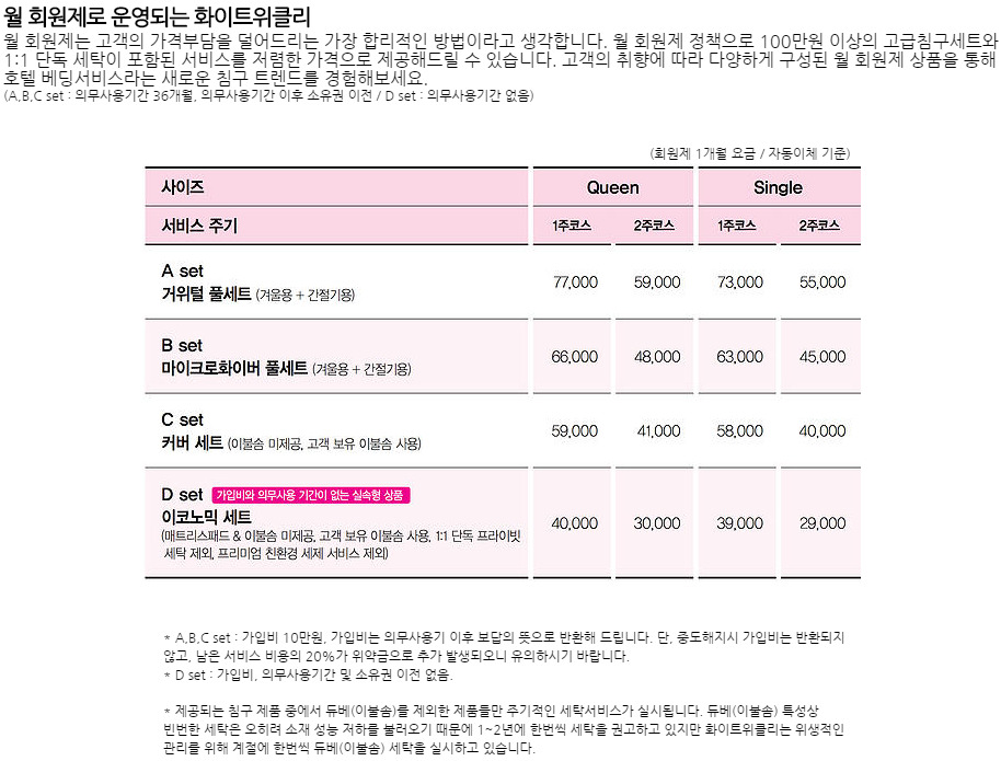 한달 가량 사용해 본 후 서비스는 만족스럽고, 베개도 화이트위클리에서 추가 구매했습니다.(마이크로화이바 베개, 개당 25000원)