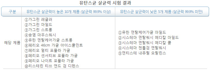 뮤탄스균 살균력 실험 결과를 살균력이 높은 제품과 낮은 제품으로 구분했네요..
