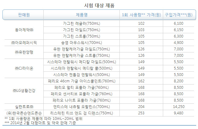 위의 표는 소비자원의 구강청결제 시험대상 제품과 가격표 입니다.