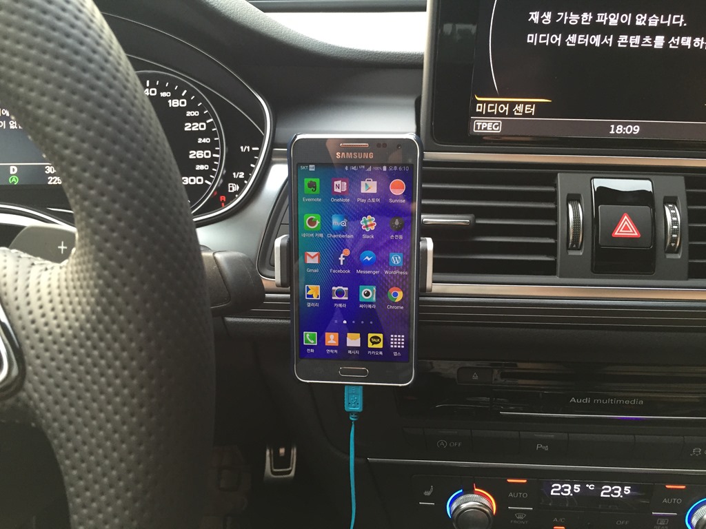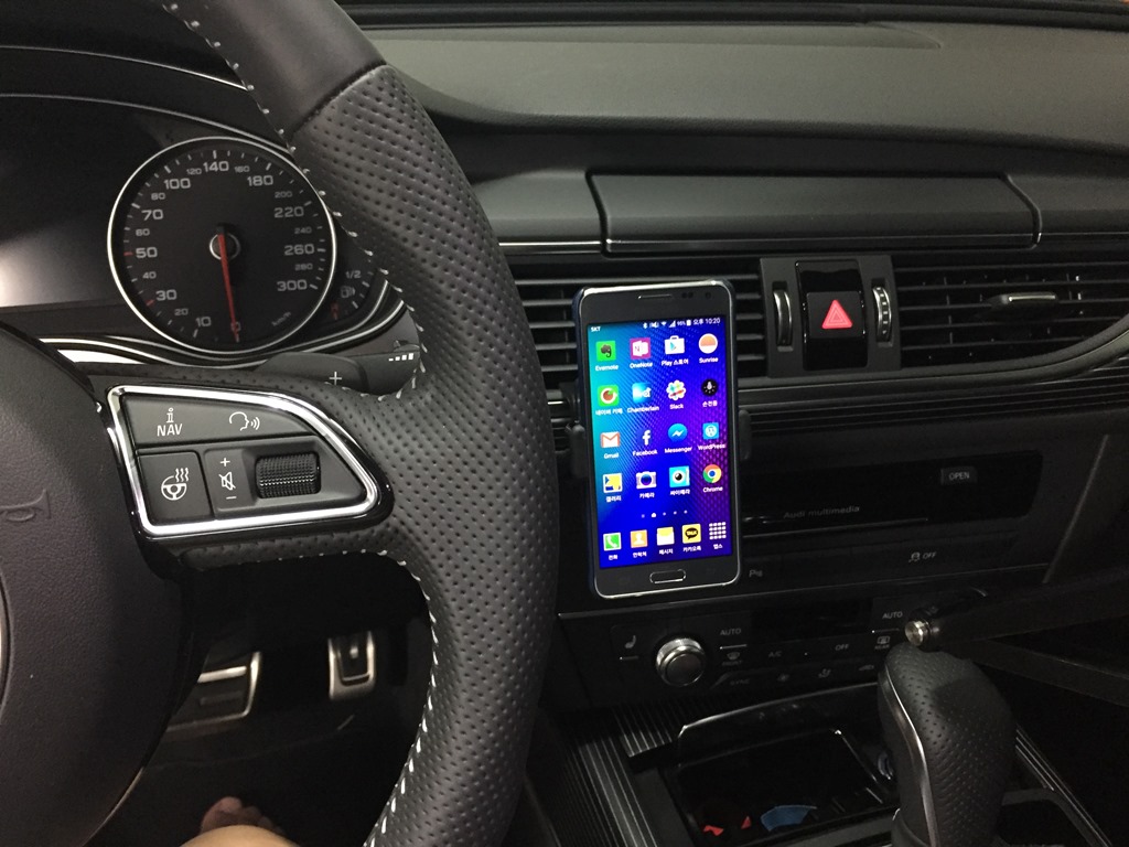 벨킨의 송풍구용 스마트폰거치대. 송풍구 손상의 우려, 스마트폰이 덜렁거리고 화면이 자꾸 아래쪽으로 눕는 문제 뿐만 아니라 한손으로는 스마트폰을 거치할 수 없는 구조와 지지력을 갖고 있습니다. 빵점짜리 제품.