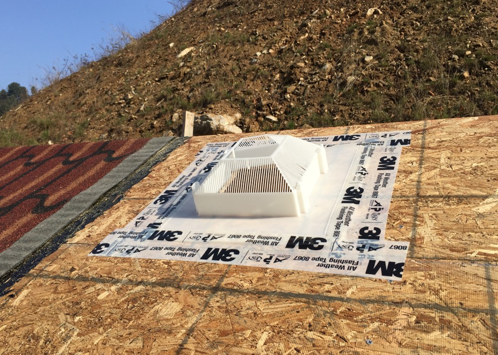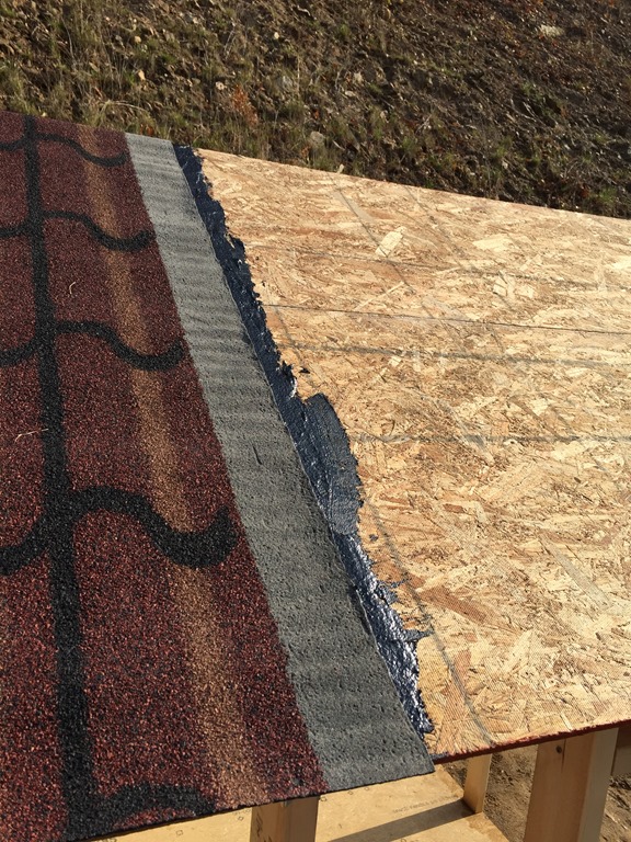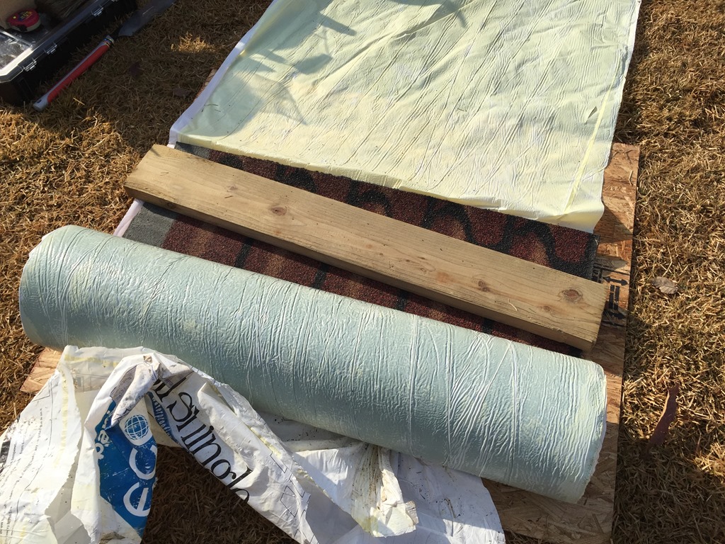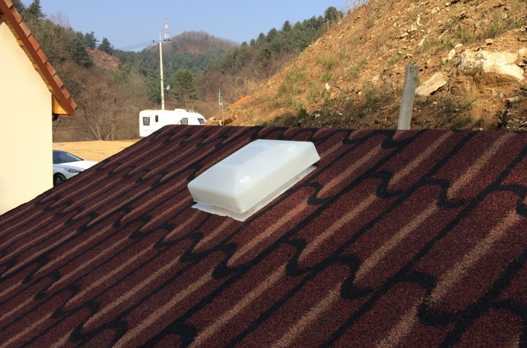 구멍을 뚫고 루프벤트창을 설치한 후 그 위에 롤슁글을 덮습니다. 위 사진이 마감 끝난 상황은 아니고, 루프벤트 아래쪽 롤슁글 틈으로 들어가는 빗물을 막기 위한 플래싱 테이프를 붙여주어야 합니다. 내구성있는 지붕용 플래싱테이프를 구입하지 않아서 작업을 마무리 못하였습니다.