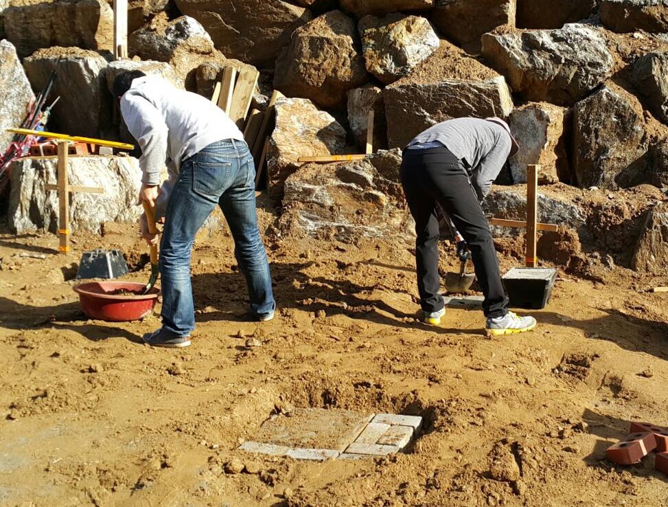 [기초작업] 먼저 정확하게 수평과 수직을 맞춘 4곳 모서리에 footer를 위치시킵니다. 4개의 주춧돌을 정확히 수평이 맞게, 그리고 4각이 모두 90도가 되도록(대각선길이가같게)위치를 잡아 고정시키는 것이 가장 중요합니다. 주춧돌만 제대로 자리잡으면 ,창고만들기의 30%는 완성된 것이나 다름없습니다.