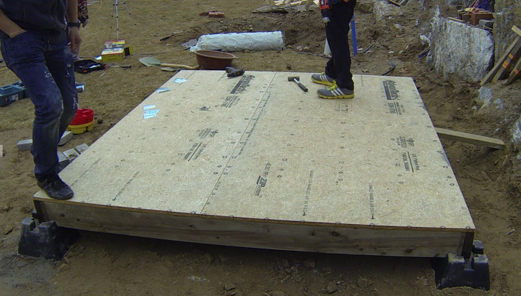 footer위에 2×6 방부목 럼버로 바닥 프레임을 짭니다. 그 위에 18mm 바닥합판을 올려 고정합니다. 주춧돌을 정확하게 위치시켰으면, 그 위의 프레임도 정확한 정방형 사이즈로 제작되어 지고, 그러므로 바닥합판도 딱 맞게 됩니다. 그러므로 바닥 footer작업의 정확한 치수와 수평맞추기는 정말 중요합니다. 바닥합판은 튼튼해야 하고, 물이나 습기에 변형되거나 부풀어오르지 않아야 하기에, 일반적인 OSB합판보다 2배 이상 비싼 Advantech 플로어링 합판을 사용했습니다. 동일두께 OSB합판보다 훨씬 견고하며, 비를 맞아도 부풀어오르지 않습니다.