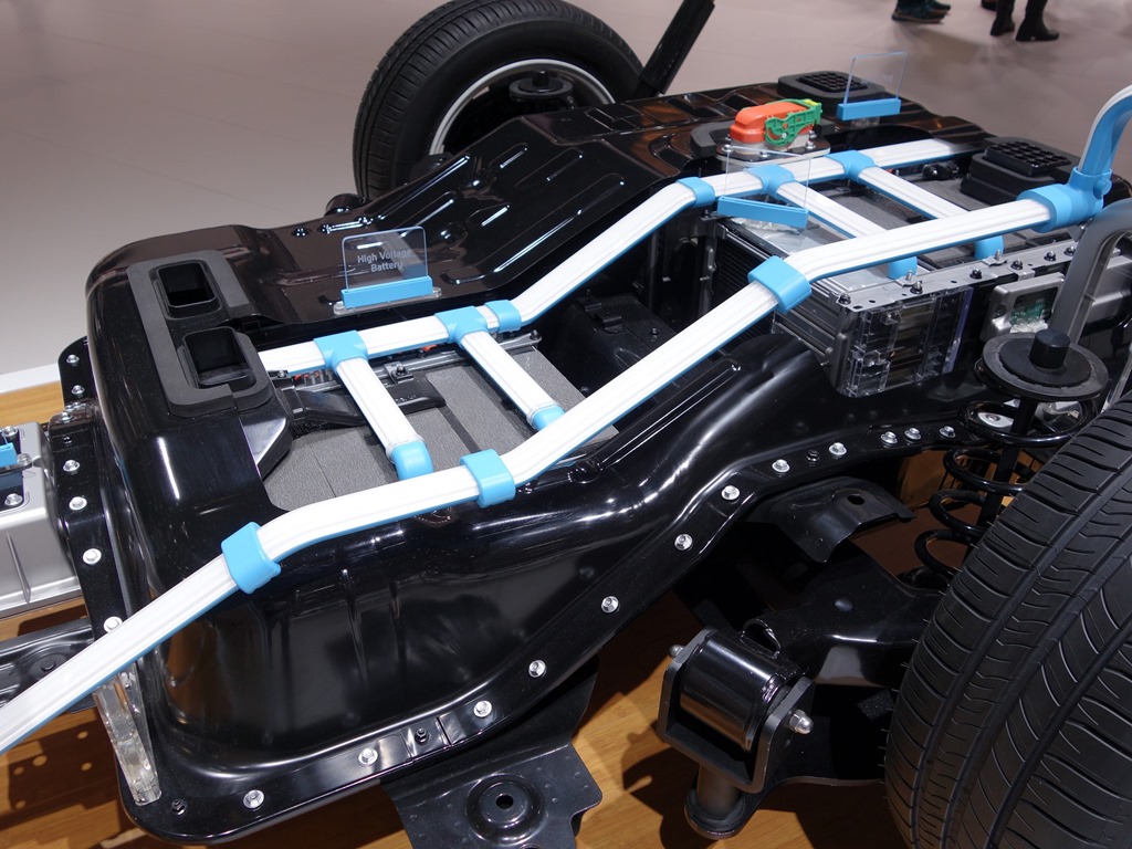 아이오닉 EV의 배터리마운트. 뒷자리 바닥과 트렁크 스페어타이어 위치에 배터리가 위치됩니다.