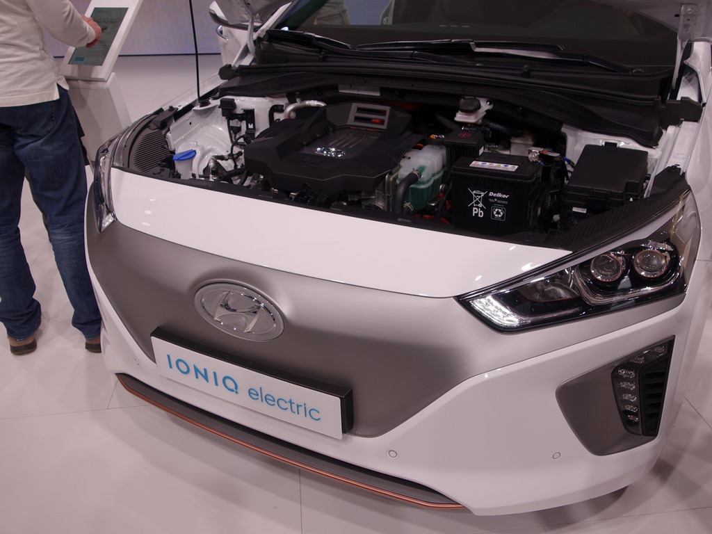 아이오닉 EV의 엔진룸. 하이브리드 모델에 비해 매우 썰렁합니다. 엔진스타팅목적에는 사용되지 않는 40A 12V SLA배터리가 엔진룸쪽에 위치하고 있습니다.