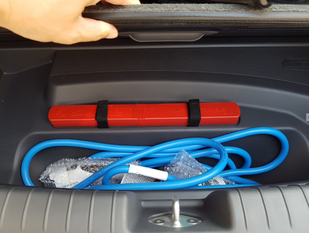 파란색 차량이 하이브리드, 흰색 차량이 EV의 트렁크 입니다. 보시는 바와 같이 동일한 용적을 가지고 있습니다. 하이브리드 모델은 오른쪽 구석에 12V 시동배터리가 들어가고, EV는 그 공간이 막혀 있습니다.