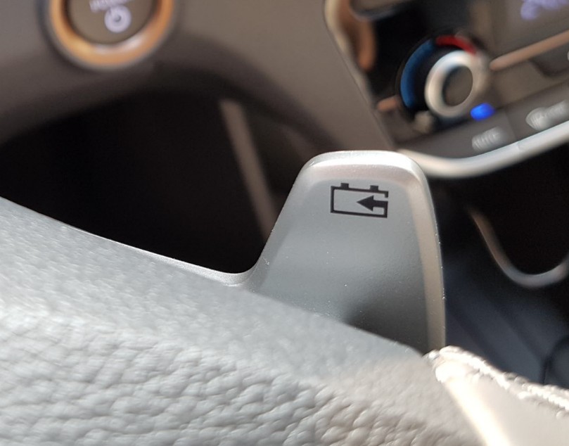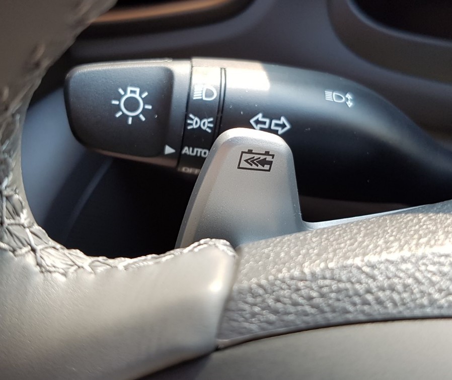 좌/우의 패들스위치는 변속기가 아닌 회생제동브레이크의 감도를 0~3단계까지 즉시 조절할 수 있는 스위치입니다. 매우 유용합니다.