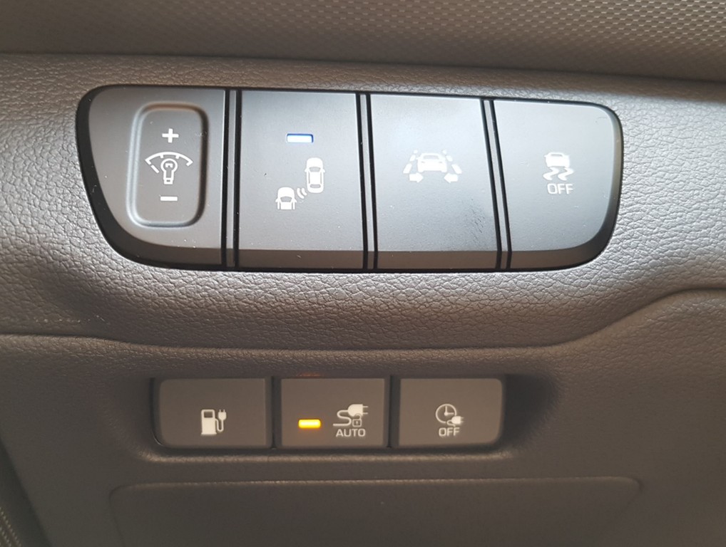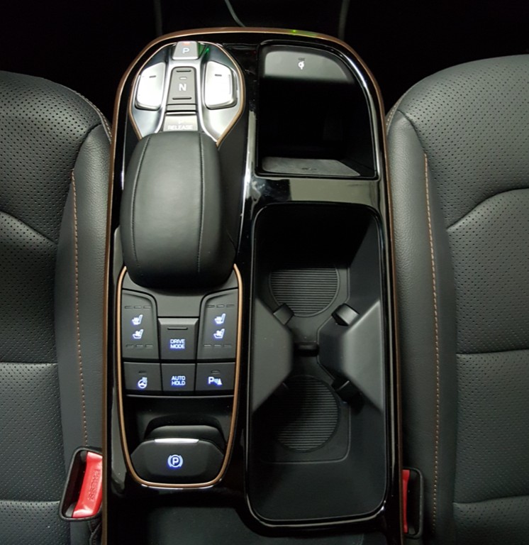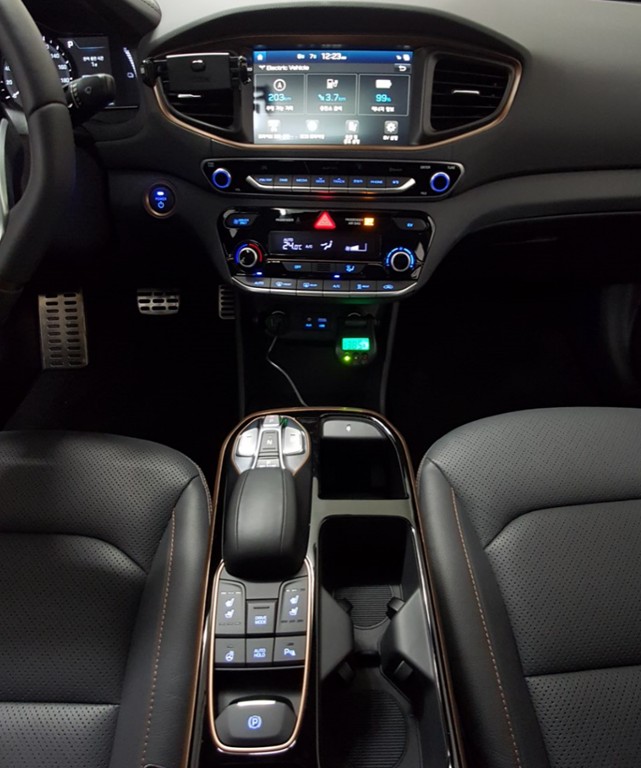 센터 콘솔디자인. 아이오닉하이브리드보다 더 고급스럽고 더 편리하게 구성되어 있습니다. 하이브리드에는 없는 전자식 파킹브레이크, 더 큰 컵홀더. 버튼타입 변속버튼. 둥그런 가죽은 다른 기능은 없는 손목받침입니다. 변속 버튼 조작시 편안합니다. 이것도 좋은 디자인. 변속버튼 오른쪽의 포켓은 Qi 휴대폰 무선 충전 포켓. 충전시 휴대폰 화면이 운전석에서 보이지 않는 각도로 위치합니다.