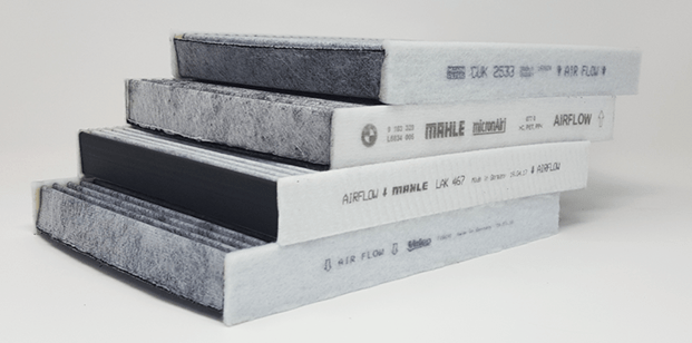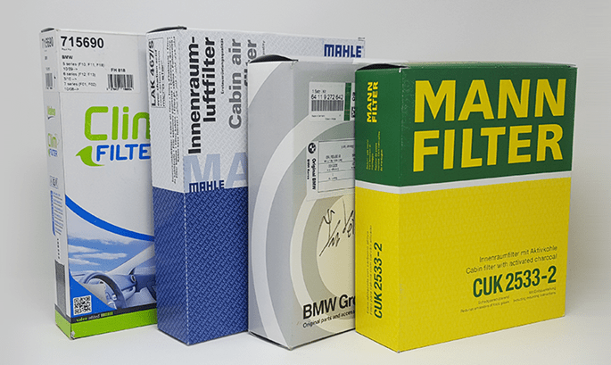 시험한 필터는 BMW의 순정 필터(말레제조)와 순정필터를 납품하는 TOP3 제조사인 MAHLE, VALEO, MANN 사의 애프터마켓 캐빈필터를 테스트하였으며, 상대비교를 위해 코웨이사의 공기청정기용 HEPA필터셋을 같이 측정 테스트하였다.