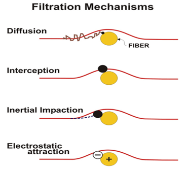 그림: HEPA 필터의 여과망의 틈새크기는 미세먼지 입자의 크기보다 크기 때문에, 입자의 사이즈에 따라 포집이 되는 것이 아니다. 입자가 필터에 포집되는 원리는, 위 그림과 같은 4가지 힘에 의해 HEPA필터의 섬유에 미세먼지가 포집되게 된다. 이때, 입자의 사이즈가 0.3μm보다 작은 경우, Inertial Impaction에 의한 포집효율은 낮아지게 되지만, Diffusion에 의한 포집효율은 더 높아져서, 0.3μm보다 더 작은 입자의 포집효율은 더 높아지게 된다. 또한, 필터의 통과속도가 낮을수록 더 작은 입자의 포집 효율은 높아지게 된다.