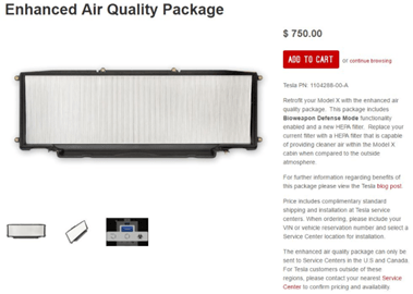 그림: 테슬라 모델S와 모델X의 EAQ패키지. 자동차용 캐빈필터 중 유일하게 대형 HEPA필터를 채용한 사례이다. 최근 출시되는 벤츠와 BMW차량은 COMBI필터급 두개를 적용하여 공기청정 성능을 HEPA필터에 근접하게 끌어올리고 있다.