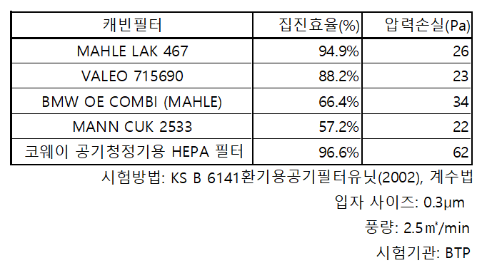 . 시중에 판매중인 캐빈필터의 미세먼지 제거 성능이 제조사별,제품별로 큰 차이가 있다.