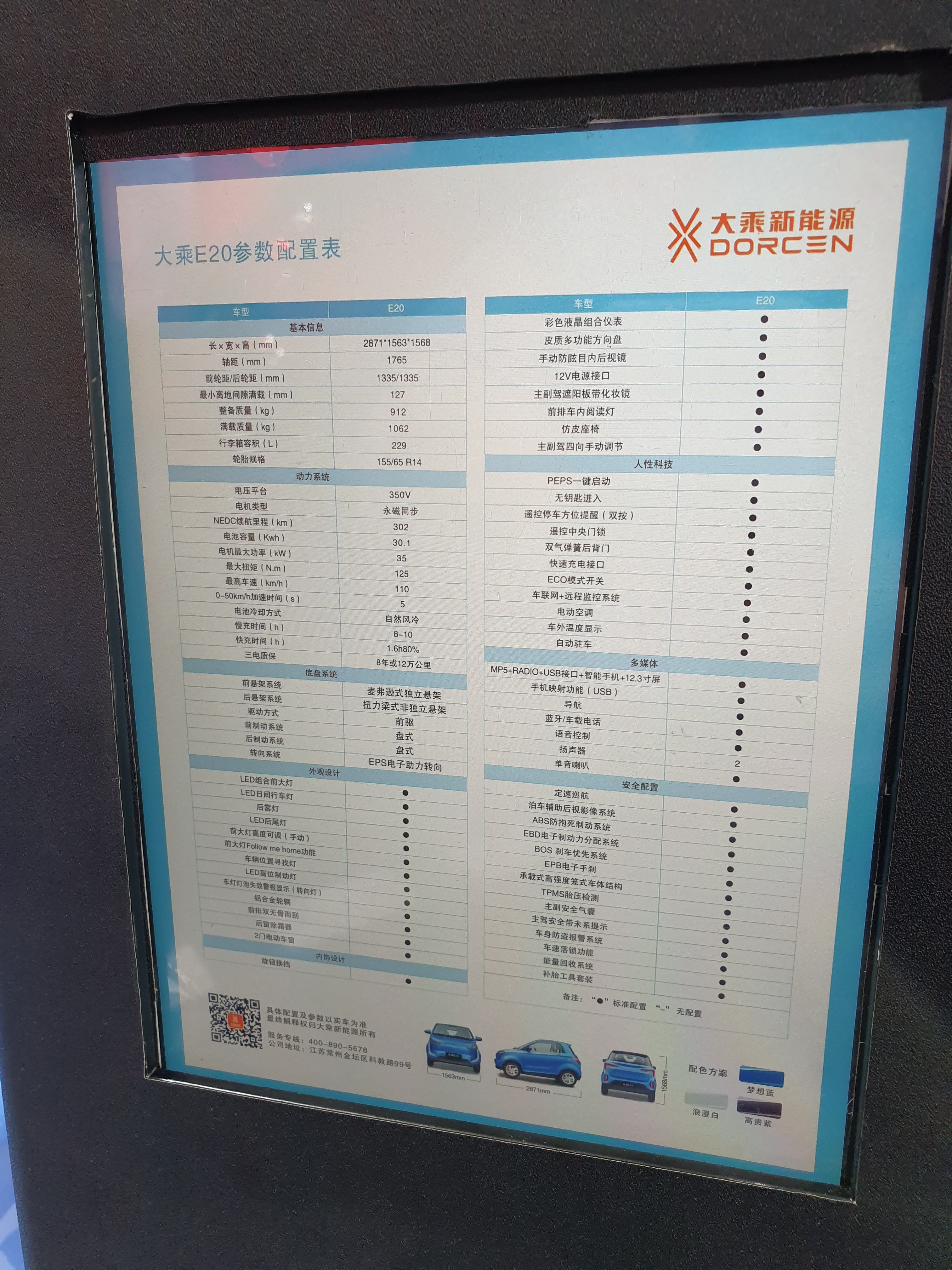 2018년 갑툭튀 설립되어 벌써 차량을 생산판매하는 DORCEN 의 E20 2인승 소형 전기차. 30kwh 배터리를 탑재하여 NEDC range 302km 주행 가능.