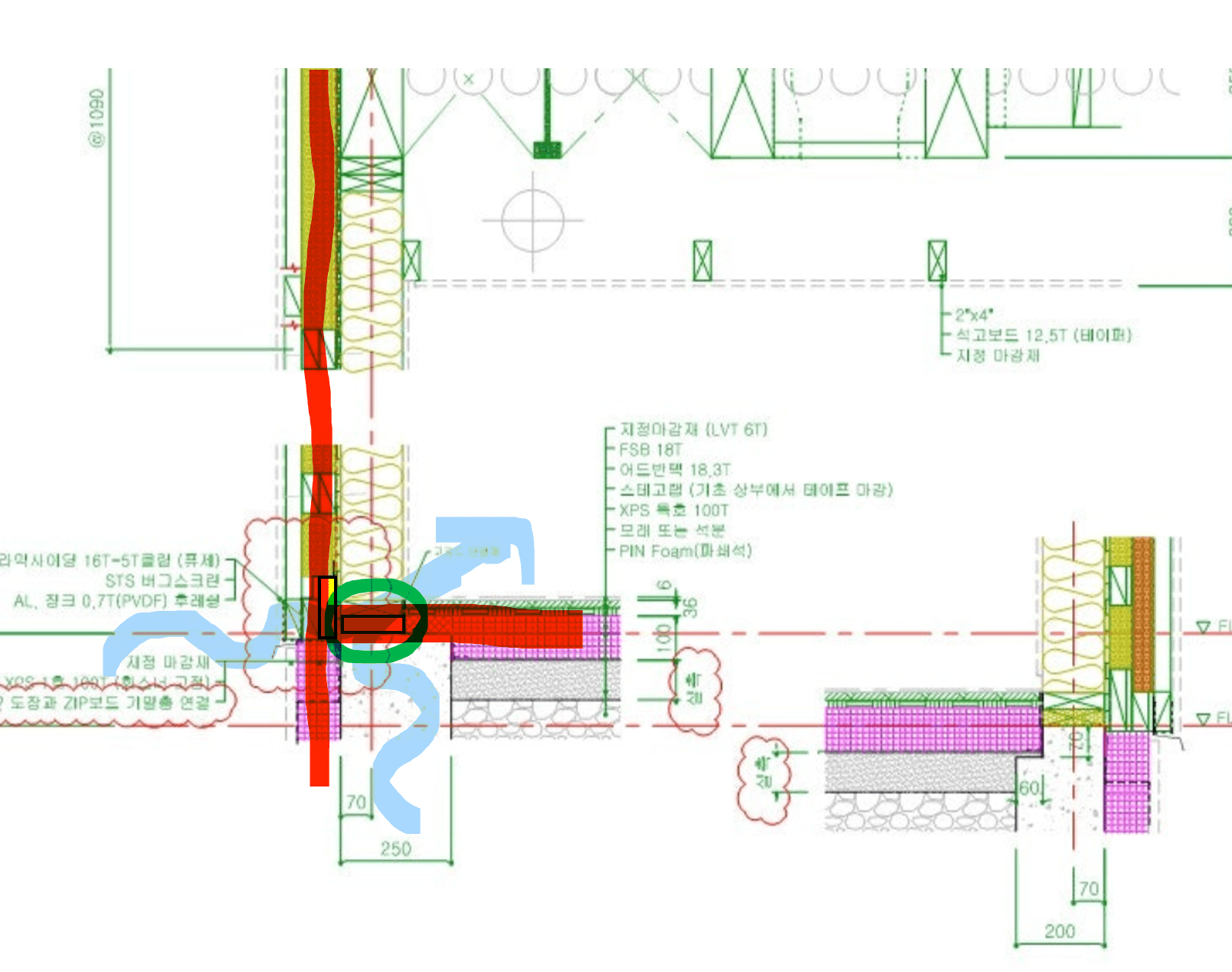 그림의 초록색 부분의 토대목을 고강도 단열블럭으로 대체하여 바닥 단열재와 외벽 단열재가 토대목에서 끊겨 있던 부분을 이어줘서 단열선이 끊기지 않게 하여 파란색 으로 표시한 경로로 냉기가 전달되는 것을 차단해 줄 수 있습니다.