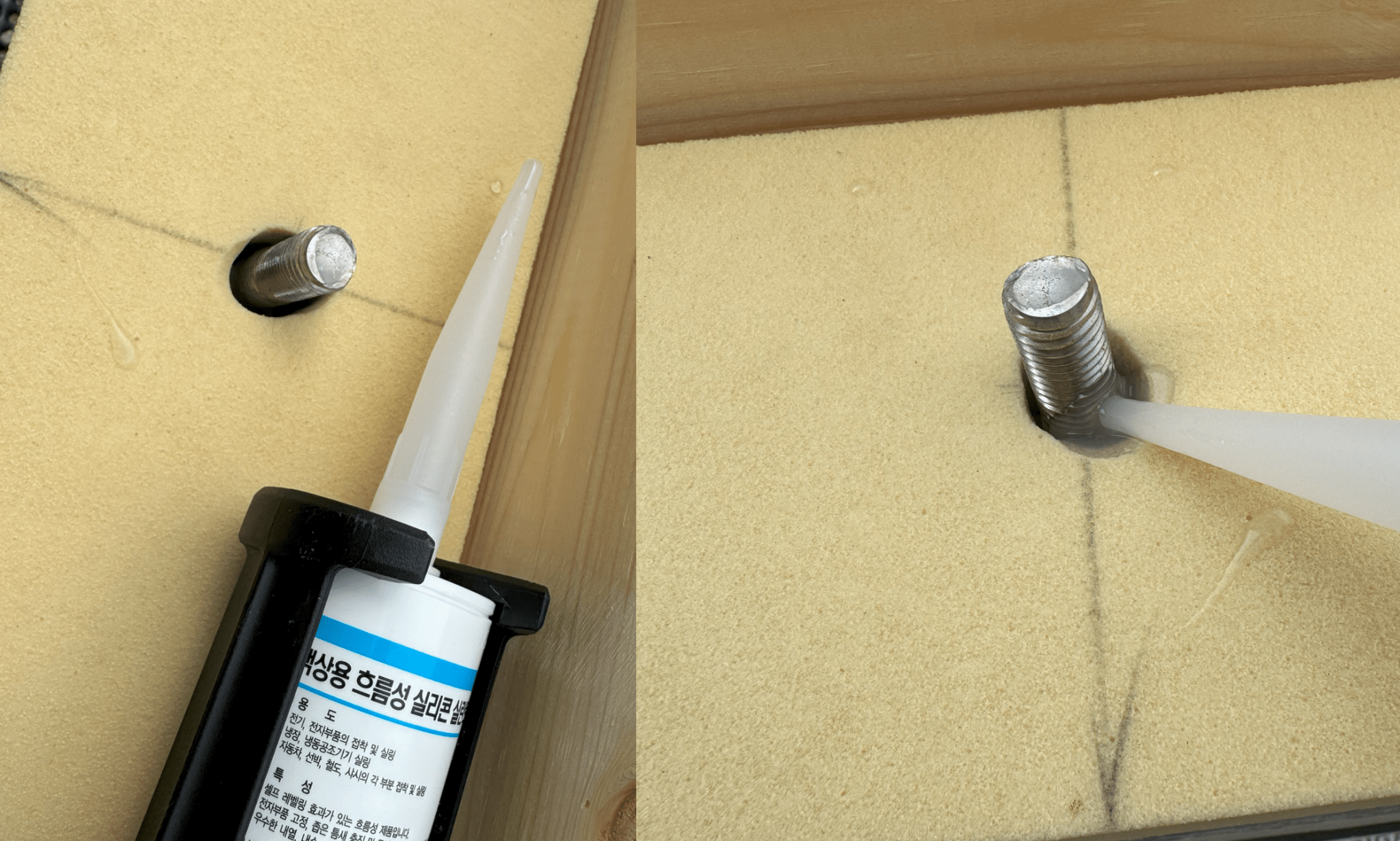 앵커볼트와 기단부단열재 사이는 흐름성 실리콘을 내부로 부어 이런 틈새도 완벽 차단. 벌레시러 습기시러