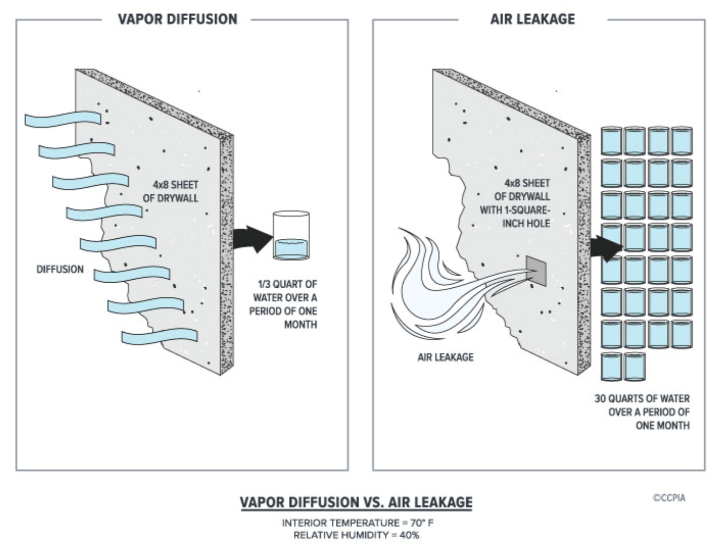 위의 이미지는 수증기의 이동량 비교이미지로 약 한평 면적의 석고보드를 확산현상으로 통과한 수증기의 량보다 그 석고보드에 가로세로 2.5cm 의 구멍이 있다면 그 구멍을 통해 통과하는 수증기의 량이 90배나 더 많음을 설명하고 있습니다.