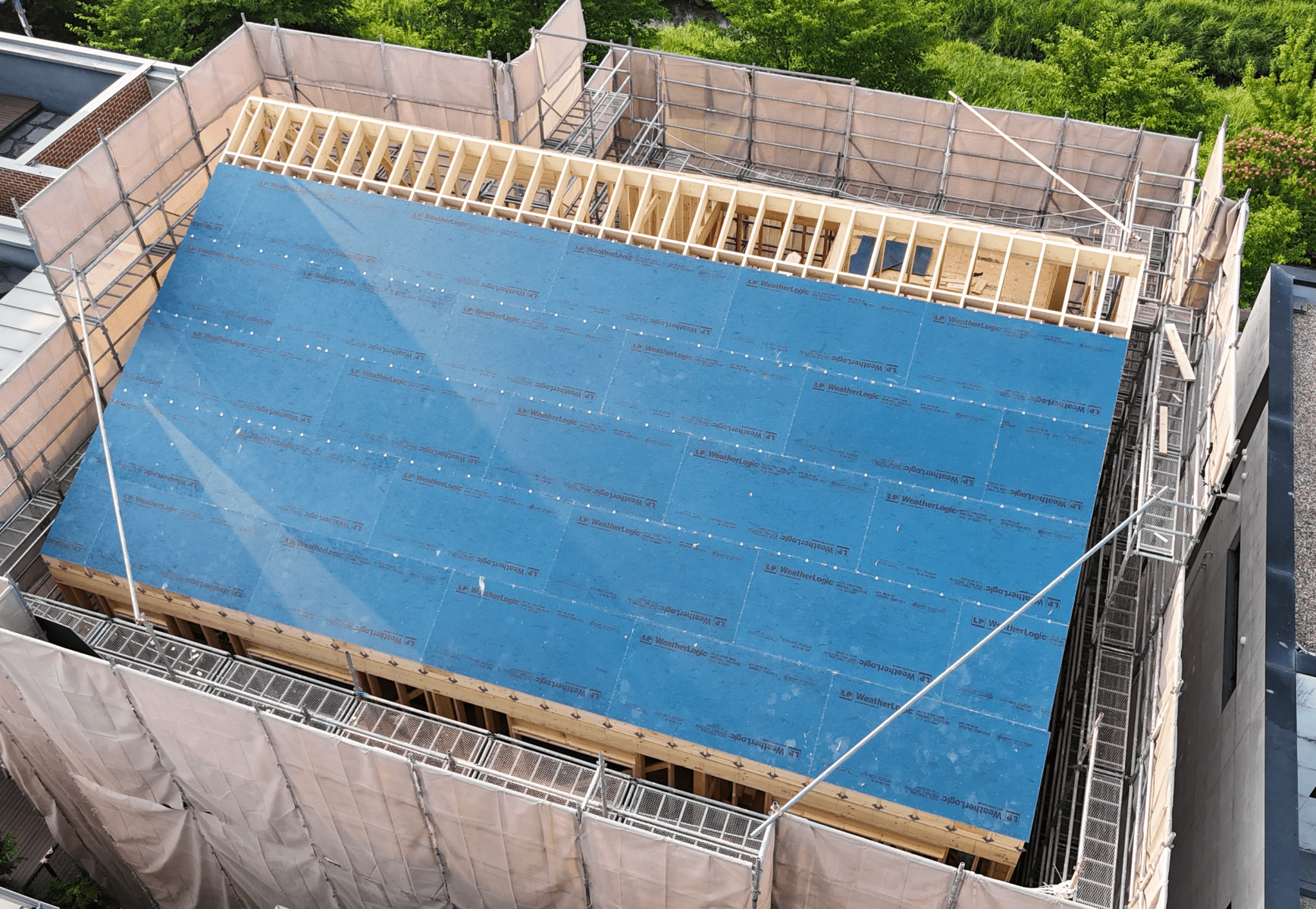 이 지붕의 WRB 레이어는 이 위에 통기층과 방수시트, 금속 지붕재로 내리는 비와 햇빛은 대부분 이 레이어까지 도달하지 못하지만, 일부라도 빗물이 WRB까지 도달하였을 때 이 물이 WRB 아래 단열재까지 도달하지 못하게 하는 마지막이자 유일한 방수층 입니다.(이 위에 시공되는 금속지붕재는 엄밀하게 보면 방수층이 아니라 배수층이죠) 전체적으로 투습성을 갖고 있어 어떤 식으로라도 벽체 내로 수분이 침투하였을 때 침투된 물이 수증기로 서서히 배출될 수 있도록 하는 역할입니다.