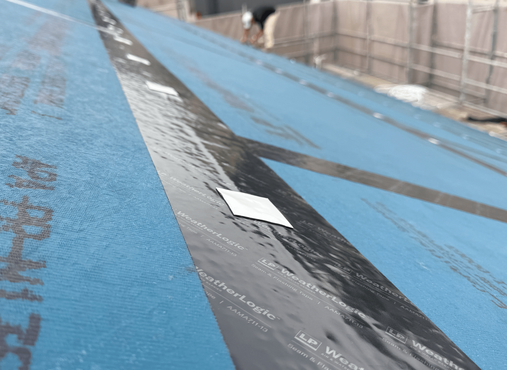 이부분의 취약점을 보강하고자 H-Clip을 덮고 있는 테이프 위에 바디가 두꺼워 물리적 완충역할을 해 줄 수 있는 프로클리마 TESCON NAIDECK 부틸테이프 (두께 1mm)를 덮어주고, 다시 그 위를 150mm 폭의 웨더로직 플래싱 테이프 또는 3M 8067 테이프로 덮어주었습니다.