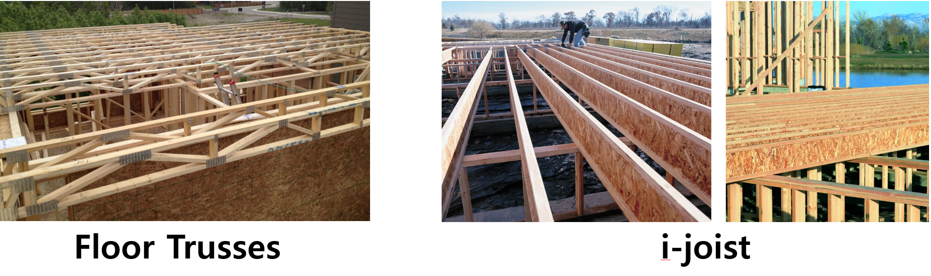 5m가 넘는 스팬을 안정적으로 받처줄 수 있는 장선은 플로어트러스와 i-joist 두가지가 있습니다. 그런데, Floor Truss는 현재 국내에 제작공장이 없어 수급이 불가능하고, i-joist 만이 삼익산업에서 수입 공급하여 국내 구입이 가능하였습니다.
