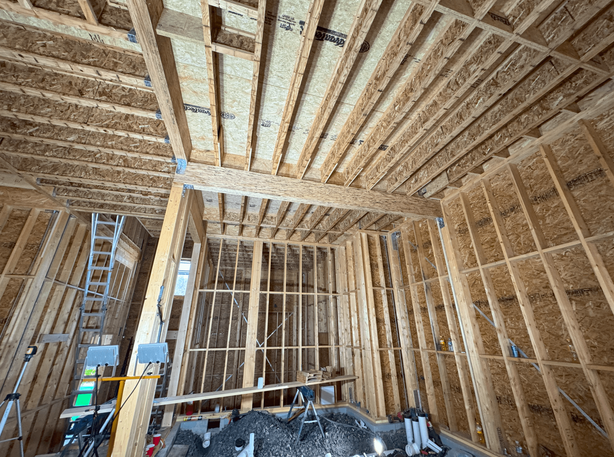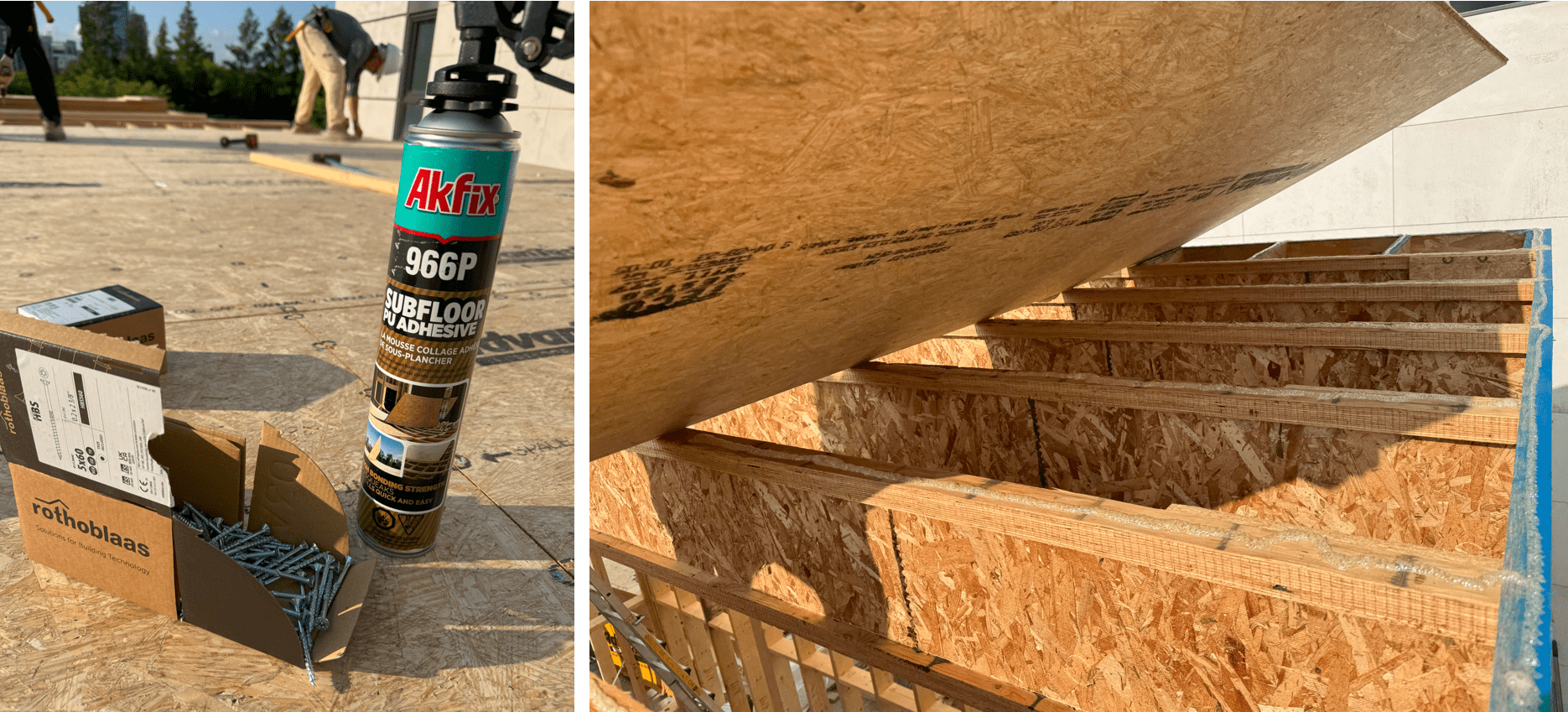 Zero30Hause는 14inch TJI-360 i-joist 위에 18mm Advantech T&G OSB 두장을 본드와 피스시공하기로 하였습니다. 그리고 바닥난방이 없기에 바닥 콘크리트 타설 하중을 감안할 필요가 없습니다. 그래서 최장스팬 구간에서도 L/600 사양을 만족하고 TJ-Rating score 55점 이상으로 최상급의 견고한 바닥을 만들 수 있을 것으로 별도의 구조계산 없이도 시공 전에 예상할 수 있습니다.