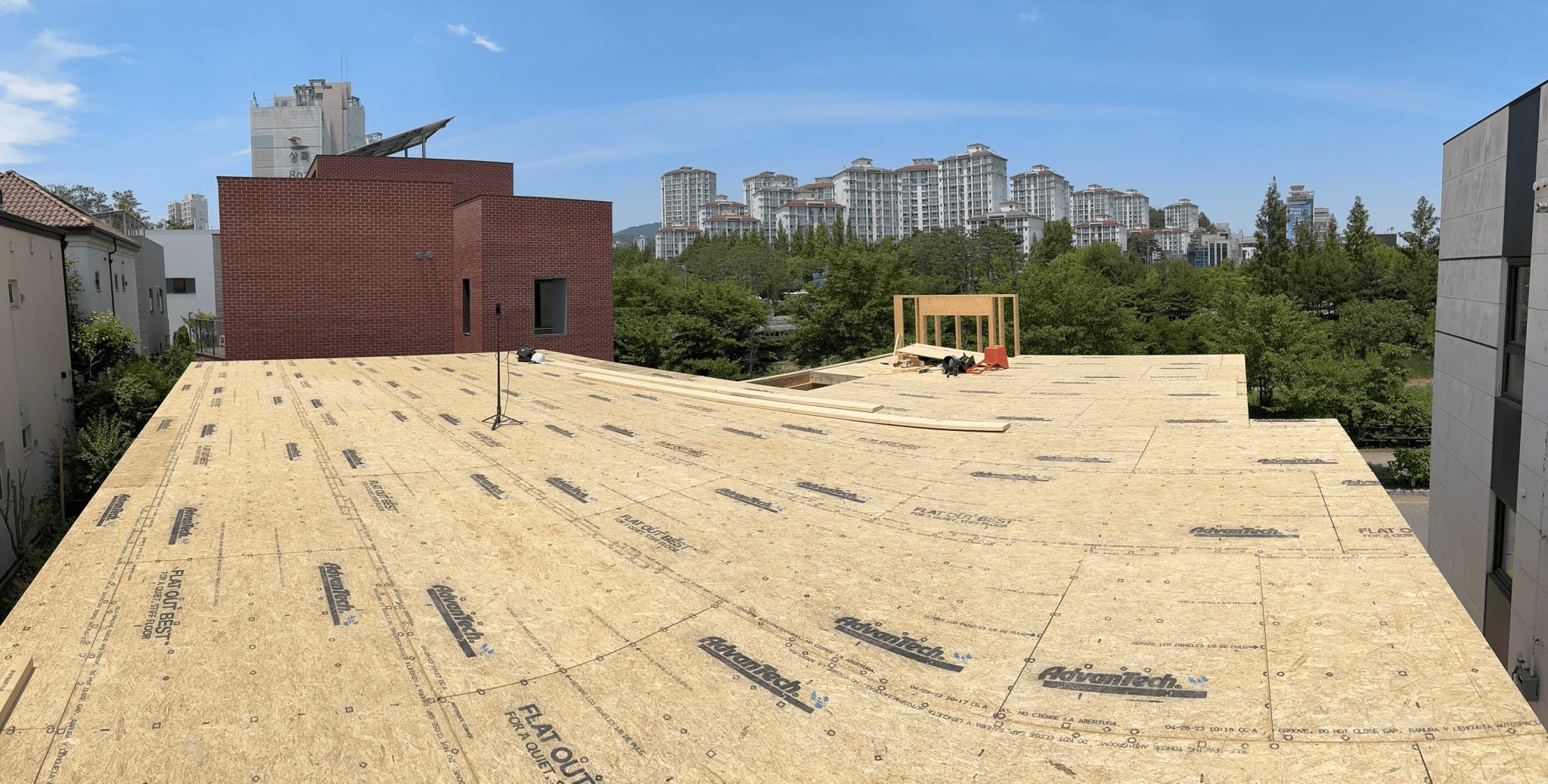 기존에 국내에서의 목조주택은 통상 2×10 조이스트장선을 사용하며, 최대 스팬 5m를 넘기지 않습니다. 그리고 3/4″ T&G OSB 1장을 시공하고 바닥난방시공을 위해 콘크리트 “방통”을 시공합니다.