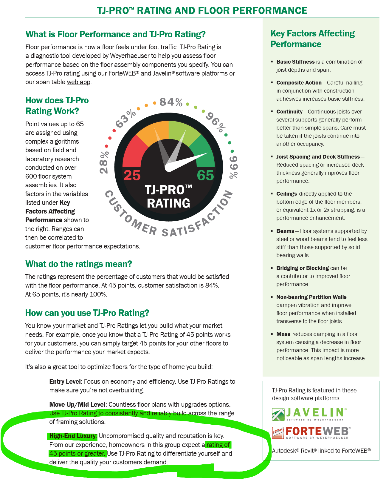 Weyerhaeuser사 TJI i-joist의 또 다른 장점은 자사 자재로 바닥 구성시의 흔들림,처짐,진동 등의 사람이 실제 바닥을 걸을때 느끼는 “체감성능”을 객관적 수치로 제시해 준다는 점 입니다.