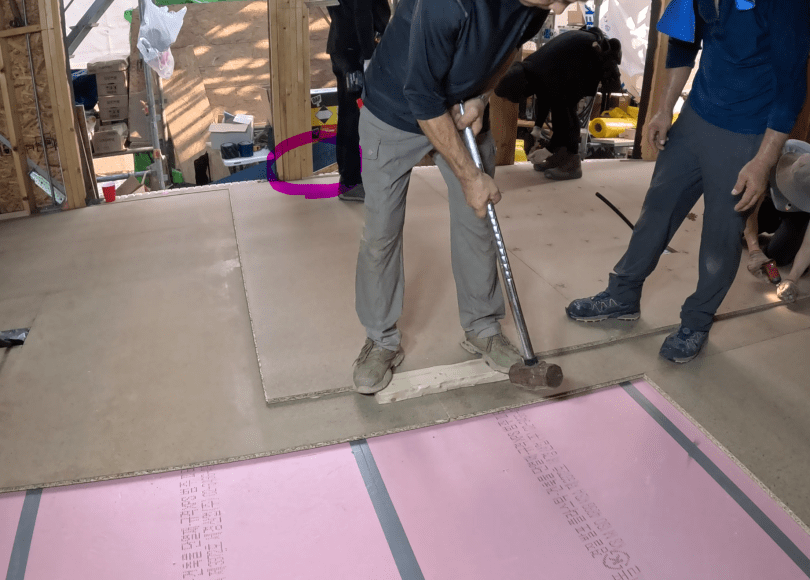 스테고랩 방습 기밀층 위에 다시한번 50T XPS를 깔아준 후 그 위에 18T T&G 합판 두장을 90도 엇갈리게 구조용 본드와 피스로 붙여 시공해 줍니다. 스크류는 1-1/8inch 스크류로 T&G합판 두장만을 결속시키고 아래 단열재까지 뚫지는 않습니다.