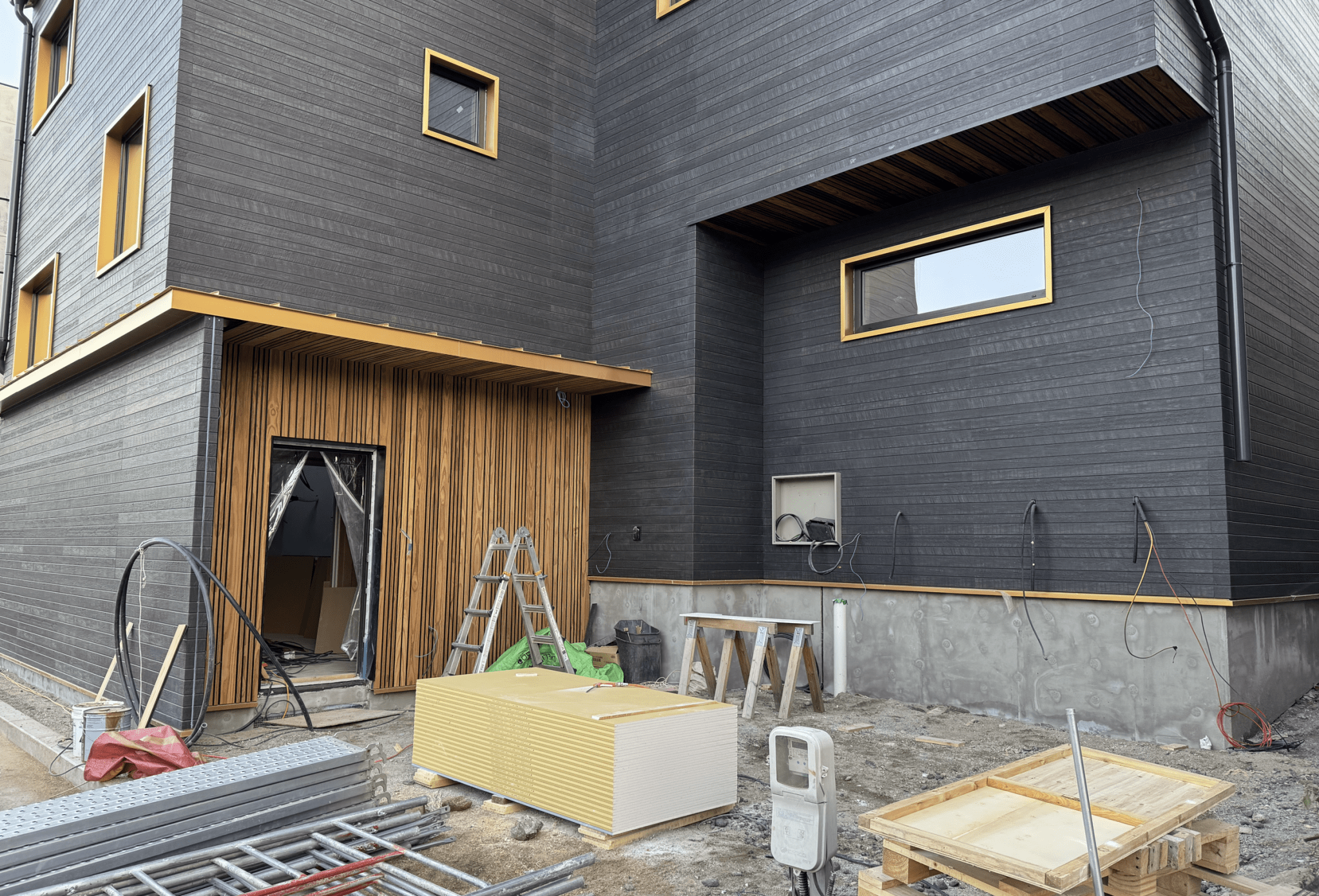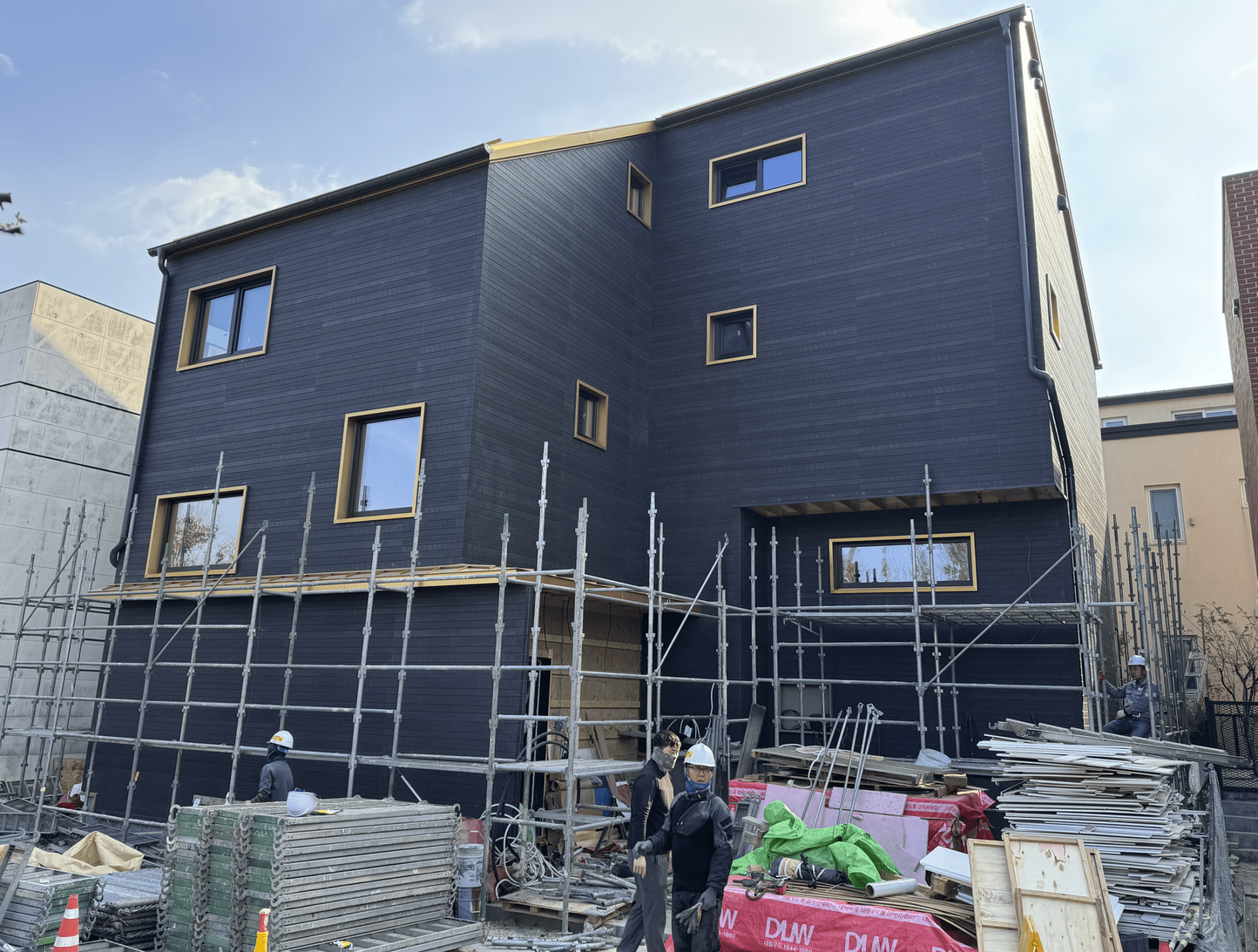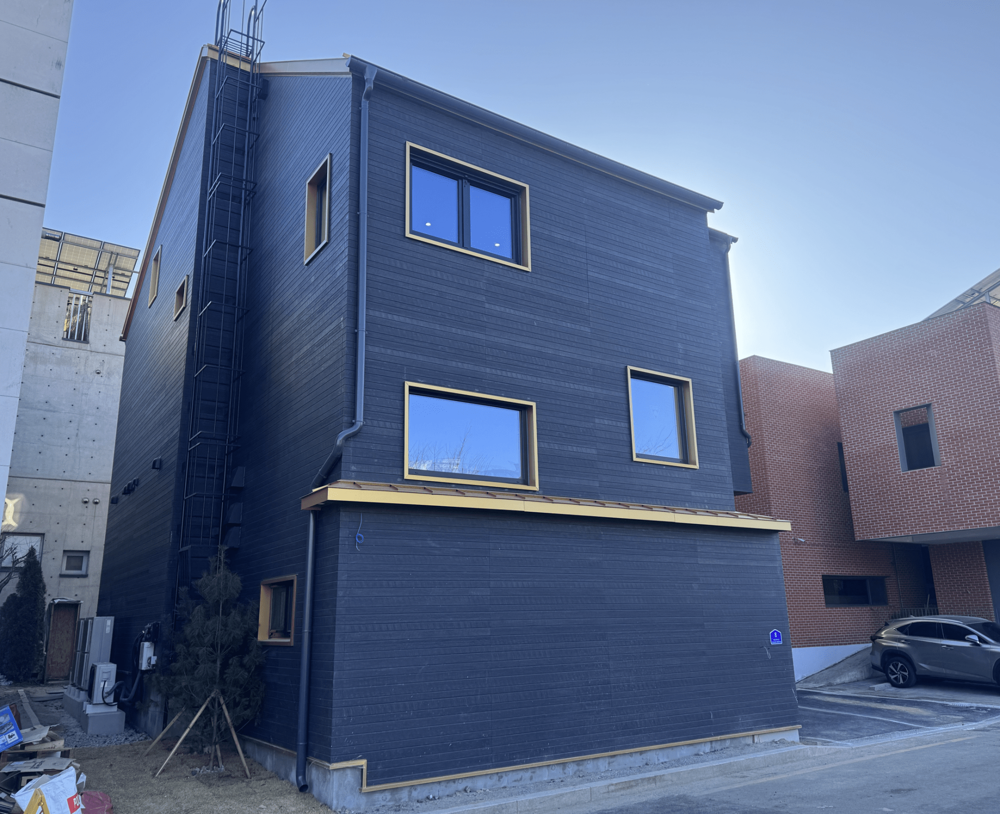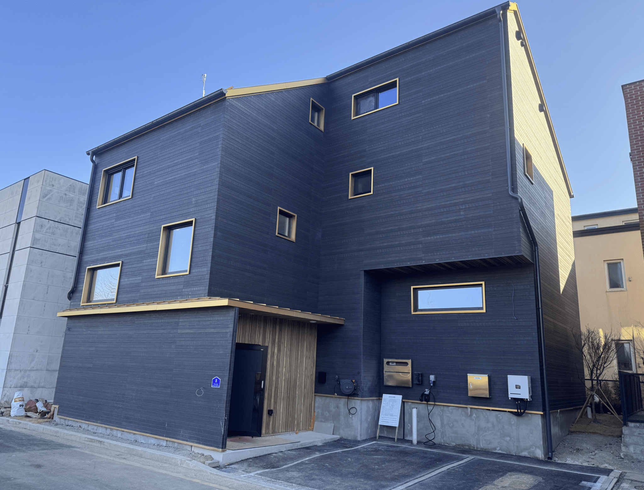 내후성 이슈로 천연재료는 사용을 못하고 모조리 인공적? 자재여서 물과 직사광이 닿지 않는 캔틸레버 부분과 북향 출입구 포치부분에는 오크탄화목 사이딩재를 시공하였습니다.